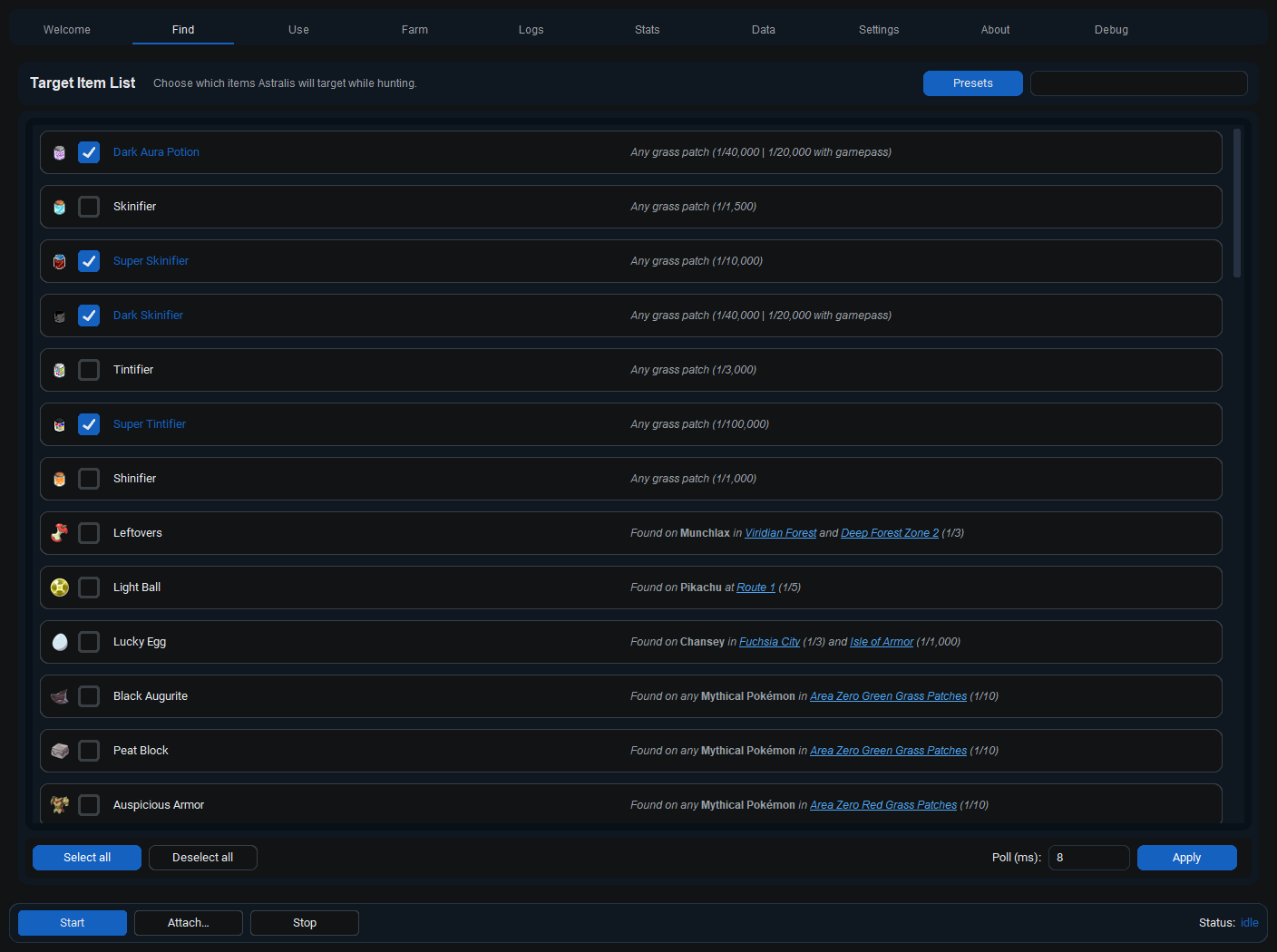 - In Astralis: enable your target items (Find tab) and pick a ball (Use tab).